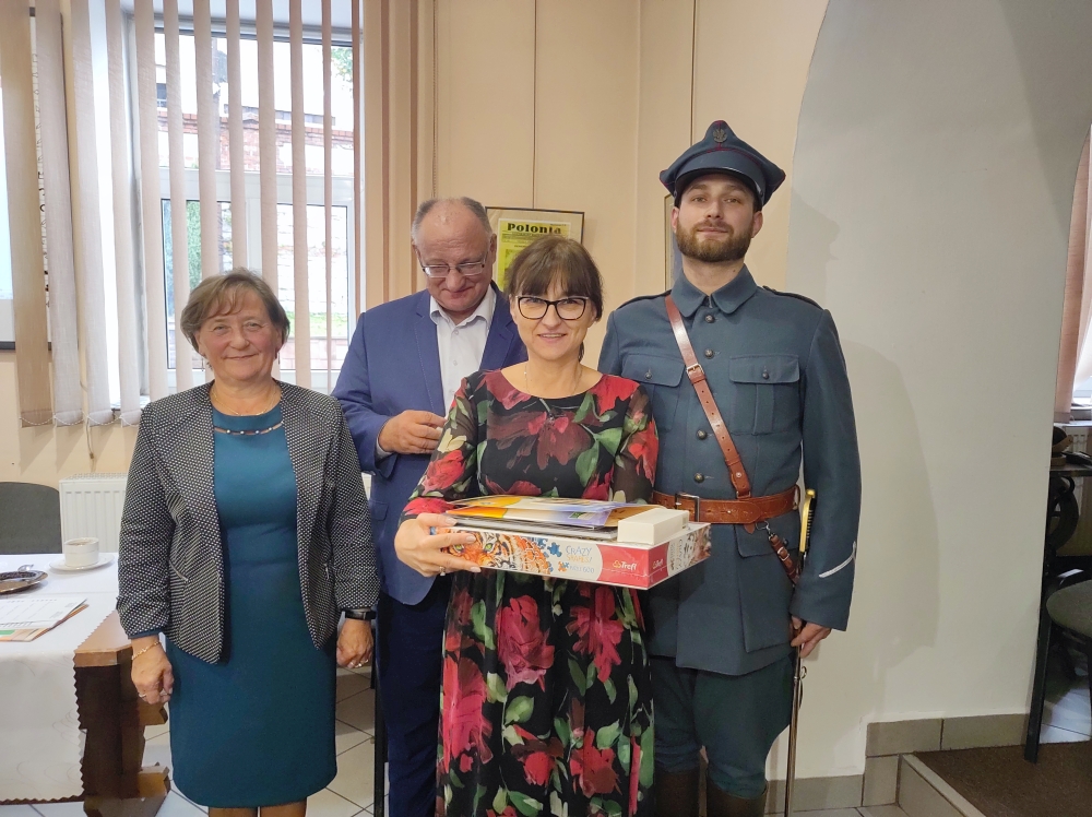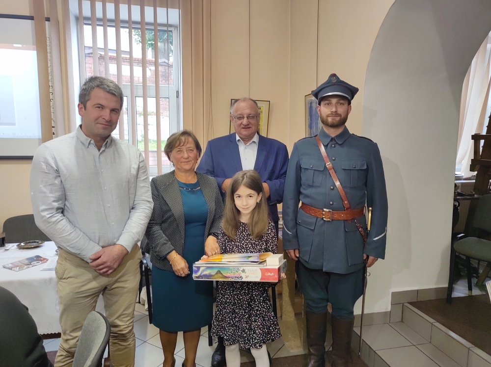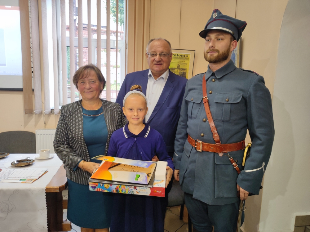 Podczas spotkania, zostały także wręczone nagrody laureatom gminnego konkursu plastycznego oraz przedstawicielom samorządów szkolnych z terenu naszej gminy. Uczynili to członkowie Towarzystwa Pamięci Generała Józefa Hallera i Hallerczyków, pan Andrzej Wojtyła z Muzeum Regionalnego i przewodnicząca TMZB Dorota Surowiak.